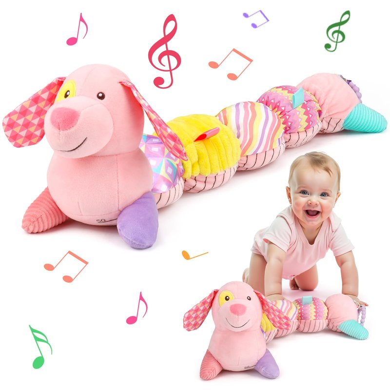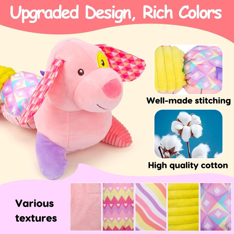 Baby Sensory Toys 0-6 Months Music Stuffed Animal Plush Dog Toy for Infant 0-3-6 Month Tummy Time Texture Soft Toys with Crinkle Rattle for 6-12 Month Newborn Birthday Gift for 2 3 4 5 Month Old Girls