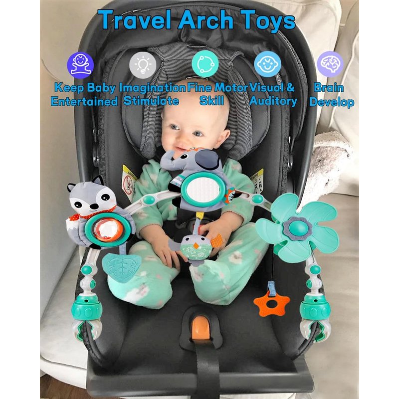 Versatile Points of Interest: The stroller arch toy is designed in cute cartoon squirrel, elephant, bird, leaf and flower. Equipped with music box, spin ball, teether, mirror, sound paper and windmill, super fun for baby to play.