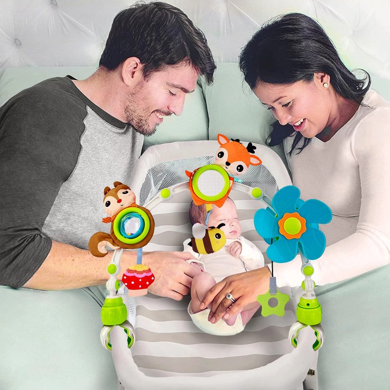 Versatile Points of Interest: The stroller arch toy is designed in cute cartoon squirrel, deer, bee, lantern and flower. Equipped with music box, spin ball, teether, mirror, sound paper and windmill, super fun for baby to play.