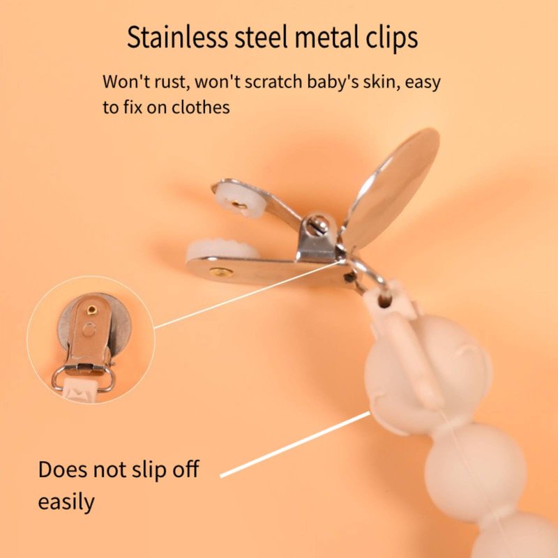 - 【STAINLESS STEEL METAL BUCKLE】The surface of the pacifier clip is very rounded and smooth, won't rust, won't scratch your baby's skin, the jagged PP material on the inside of the clip is non-slip, easy to clip on clothes, it can be easily fastened on top of pacifiers, clothes, strollers, car seats, etc., and you don't need to worry about pacifiers dropping on the floor and getting lost any more.
