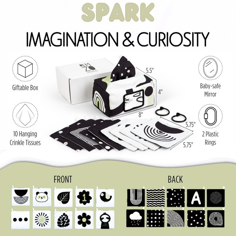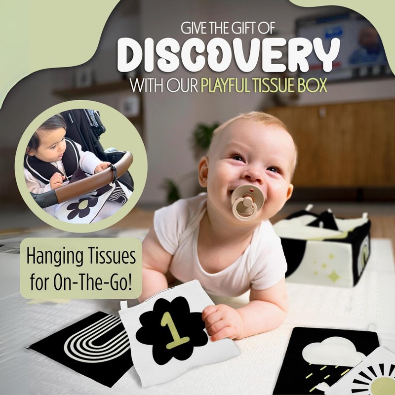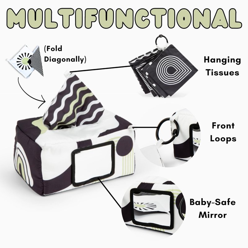 - High Contrast Design: Effectively combine baby learning toys and playtime with this gender neutral baby toys set. The early development tissue baby toy includes black and white colors with a pop of green, ensuring appropriate visual stimulation on this infant baby tissue box.