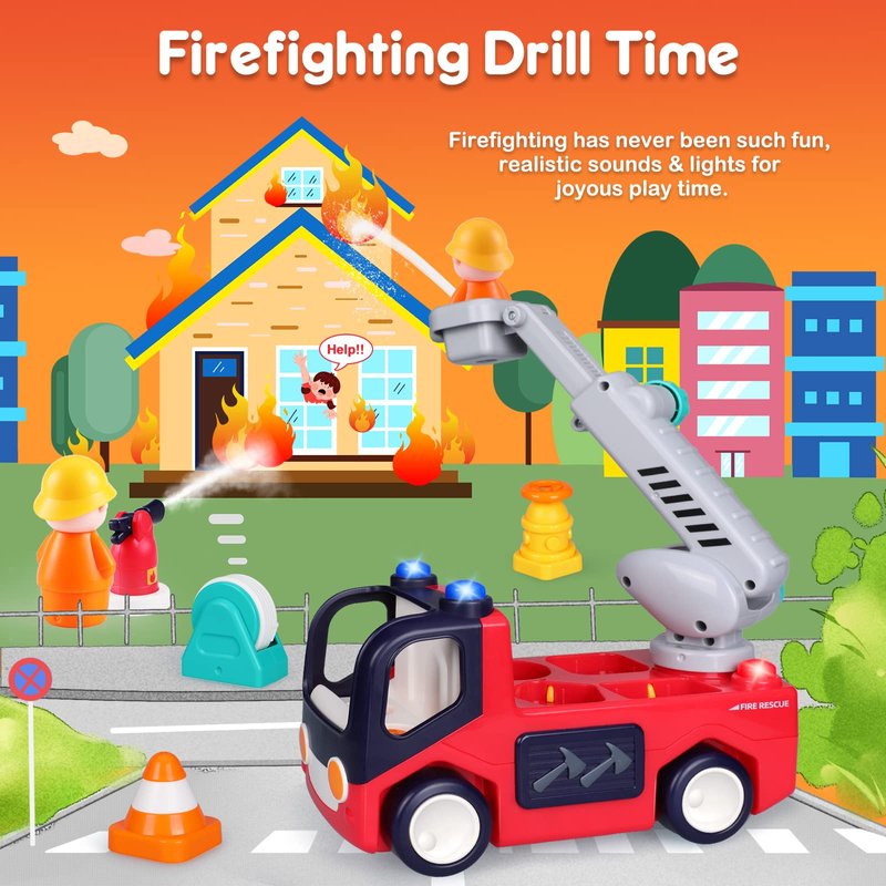 - Realistic Early Learning Fire Truck: Adorable fire truck toy for 1 year old boys with flashing lights and realistic sound effects, deeply catch your baby's attention. Equipped with 2 firemen, 4 firefighting tools and 3 fire button, babies could play role-playing to simulate real firefighting scenes, achieve your baby's dream of a firefighting hero. Take this truck car toys for 1 2 3 toddlers home