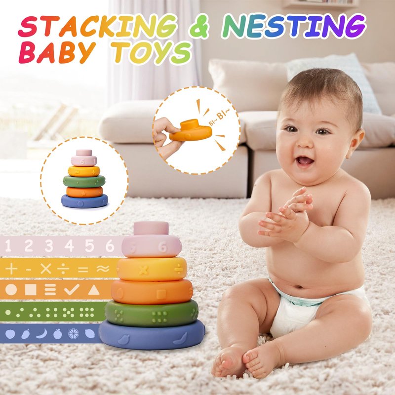 - Baby Toys Blocks Toy:The set boasts embossed designs on blocks and rings, featuring relief patterns such as animals, fruits, numerals, and geometric shapes. This not only sparks visual interest but also promotes intellectual development, critical thinking, and practical skills. Acting as sensory tools, the toys offer a multi-dimensional experience by stimulating visual, tactile, and auditory senses.