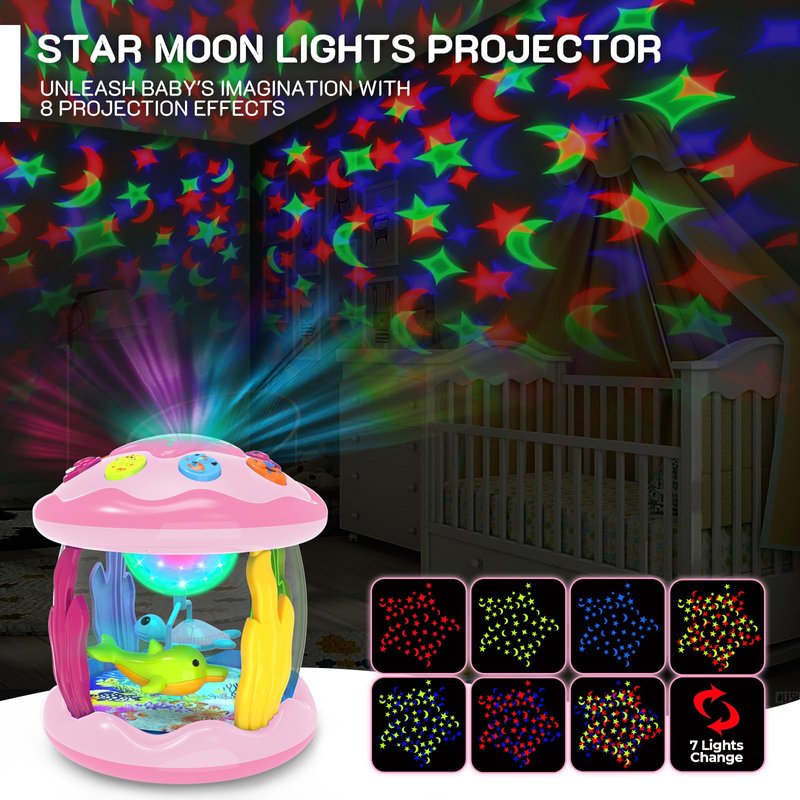 - Explore 360° Rotating Ocean World - Dolphin and turtle rotate 360 degrees like a merry-go-round under gorgeous lights and soft music, creating a wonderful undersea world atmosphere and stimulating toddlers' unlimited imagination. The lovely baby toys for 1 year old project light down onto the ground, and protect your baby's eyes from harm. Soft light disperses the darkness and builds a dreamy night for your baby.