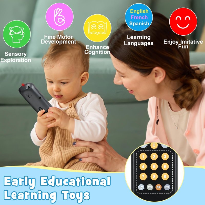 Baby TV Remote Control Toy with Sound and Light, Music Toys for Baby 6-24 Months, Infant Teether Toys, Early Development Toys with 3 Language English/French/Spanish for Toddlers 6 12 18 Month