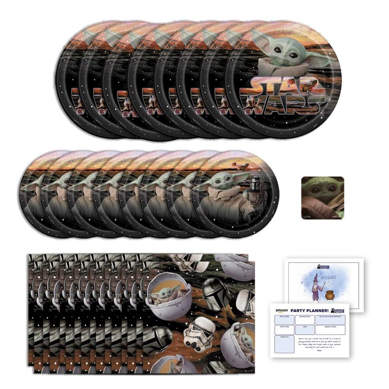 Baby Yoda Mandalorian The Child Themed Happy Birthday Party Supplies for Kids, Serves 8, Decor and Dinnerware with Plates, Napkins, Sticker and Party Planning List