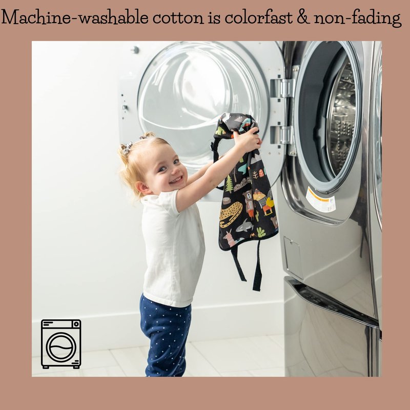 - ADJUSTABLE NECK STRAP with buckle lets you tailor BABYBOET Kids Cooking Aprons to your child’s size. Fun, brightly colored and engaging prints are gender neutral and suitable for boys and girls alike.