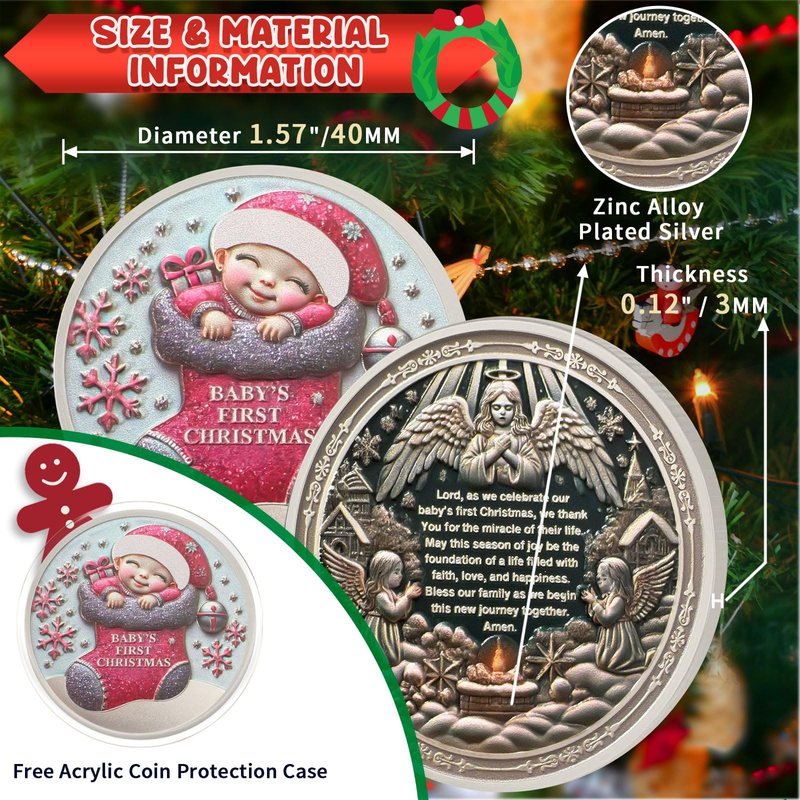 With the theme of cute baby, this Christmas gift shows the joyful atmosphere of the festival and the good wishes for the baby's first Christmas.The unique Christmas coin design and quality craftsmanship make this Christmas decoration an ideal New Year's gift.