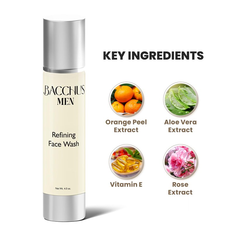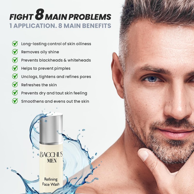 - Mens Face Wash: The Bacchus Men refining face wash thoroughly cleanses and delicately removes dead skin cells, this acne face wash also unclogs pores and leaves you with smooth skin.