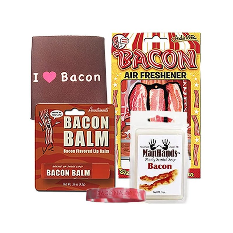 - Bacon Addicts Gift Pack includes: Bacon Soap, Bacon Air Freshener, Bacon Lip Balm, I Heart Bacon Can Cooler & Bacon Addict Silicone Wristband