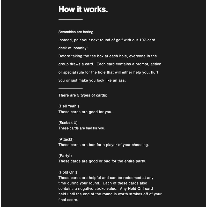Before taking the tee box at each hole, everyone in the group draws a card. Each card contains a prompt, action or special rule for the hole that will either help you, hurt you or just make you look like an ass.
