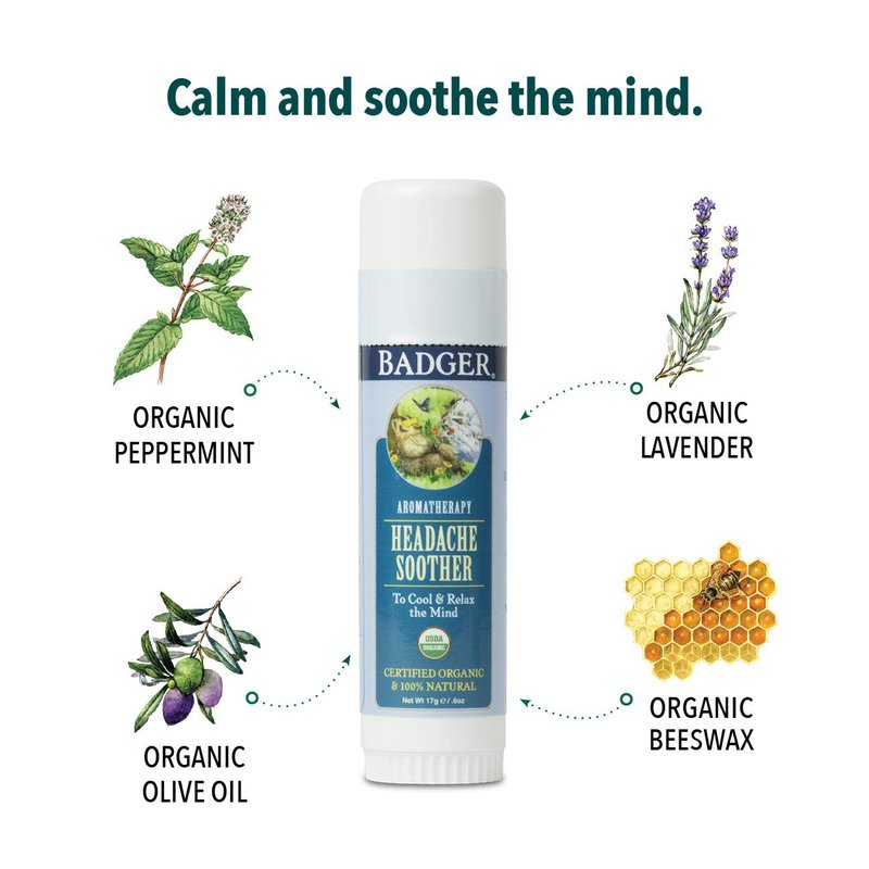 Badger - Headache Soother, Aromatherapy Balm Stick, Certified Organic, Headache Relief Aromatherapy Oil, Peppermint Eucalyptus & Lavender Essential Oils, Stress Relief, 0.6 oz