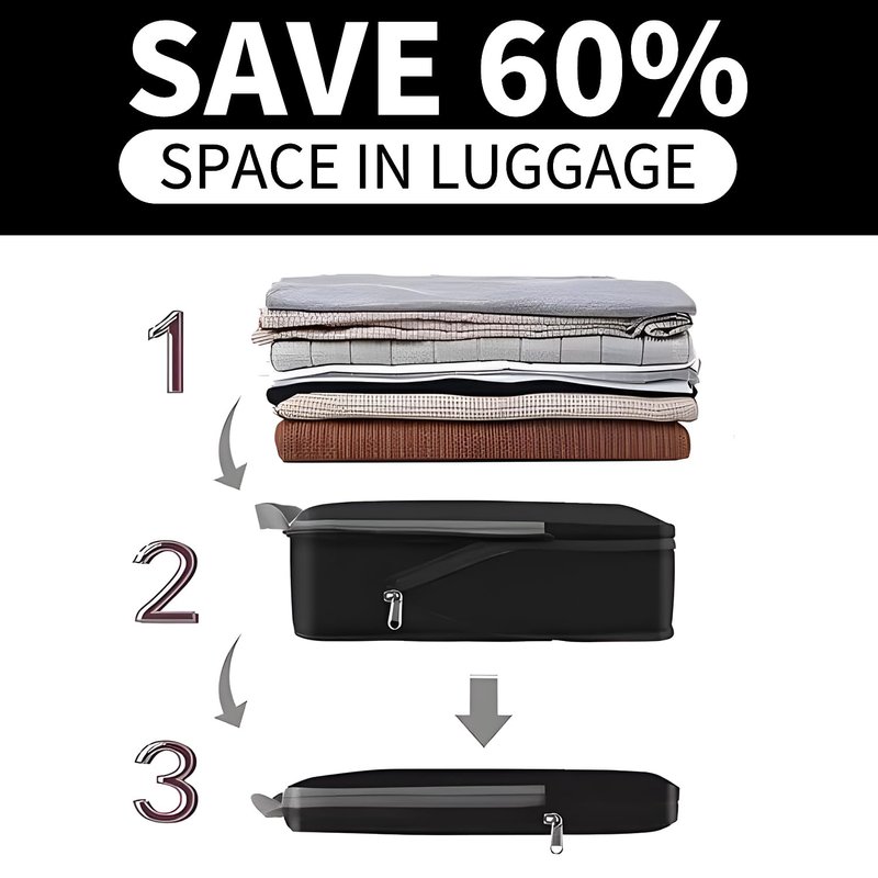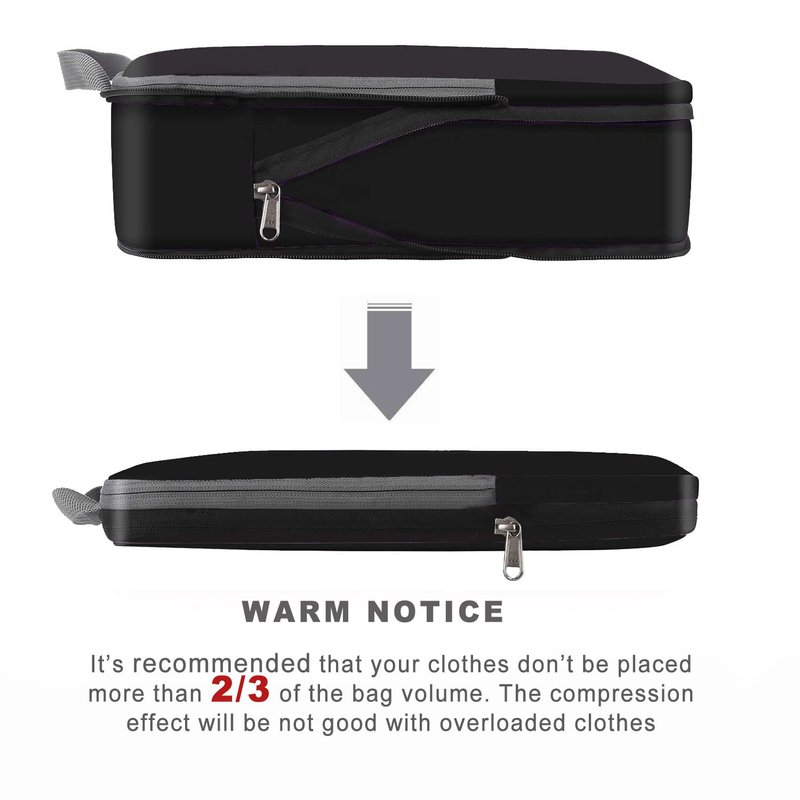 - HOW TO MAKE THE COMPRESSION HAPPEN? - There Is a Extra Zipper Outside Of Our Compression Packing Cubes Which Can Be Zipped Up To Flatten The Cubes And Save The Space As Far As Possible. It Just Works Like a Vacuum Sealer. You Just Need To :1) Fold Your Clothes And Flatten Them 2)Pack Clothes In The Cubes And Zip The Normal Zipper. 3)Put A Finger On The Back Of The Zipper In The Space When Compressing The Packing Cubes In Case The Zipper Get Stuck In Fabric.