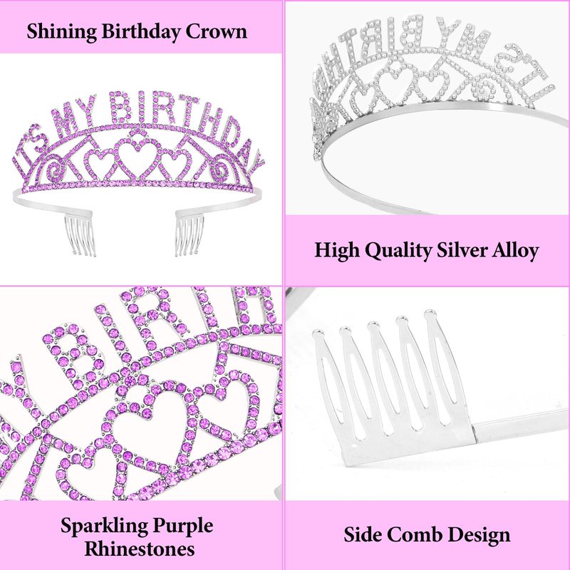 BAHABY It's My Birthday Sash & Rhinestone Birthday Tiara Set Birthday Sash and Crowns for Women Happy Birthday Decorationss- Purple