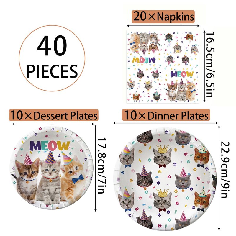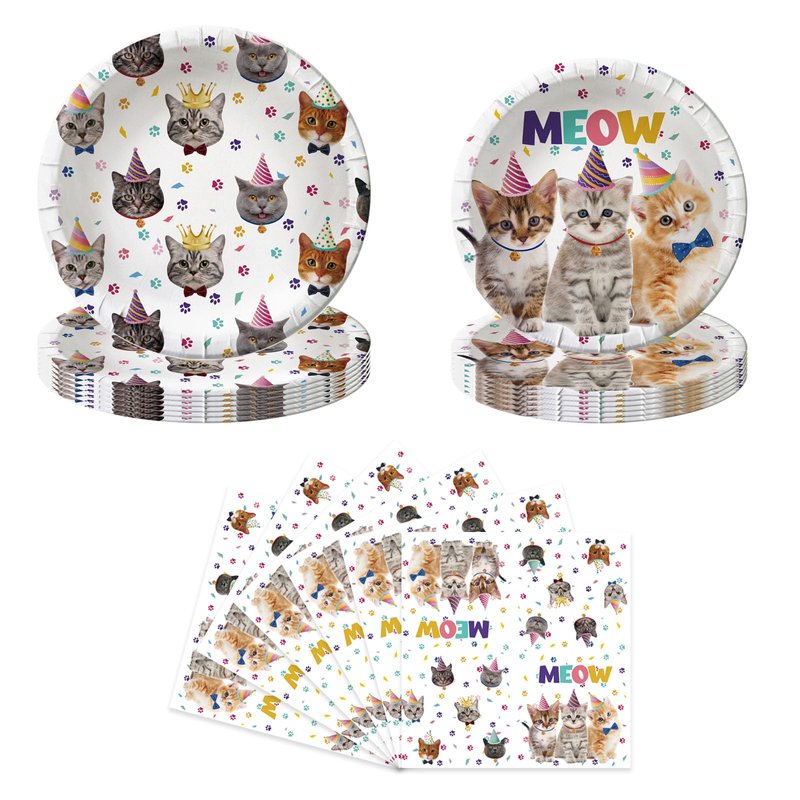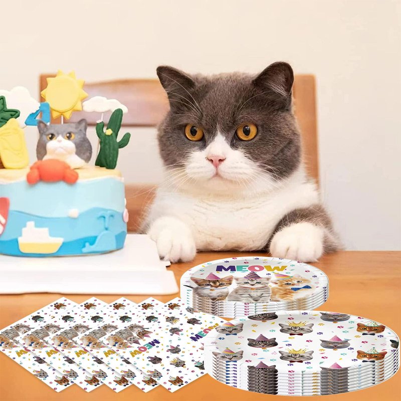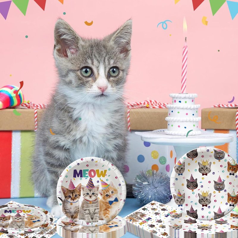 - 3.Add a touch of whimsy to your party with our beautiful cat birthday dinner plate and napkin set, featuring meow letters, cat paw prints, and charming kitten illustrations. These cat party supplies are the perfect choice for cat lovers of all ages.