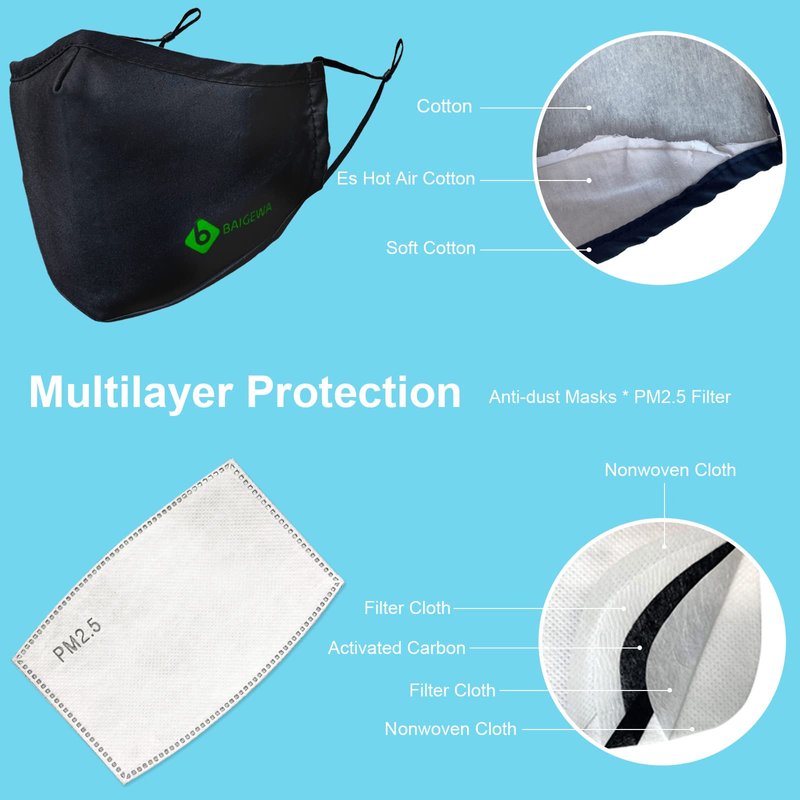 - [Stay Safe with BAIGEWA Cloth Face Mask] BAIGEWA washable face masks can cover the entire area of the mouth and nose, each mask also comes complete with 1 pcs PM2.5 carbon filters to provide you extra protection.