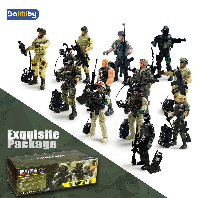 12 distinct styles of army men soldiers toy accompanied by a comprehensive black weapon set, featuring authentic details, exquisite design, and a diverse array of components.