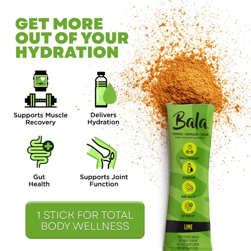 Bala sports nutrition powders utilize all-natural, plant-based ingredients including turmeric and active enzymes from pineapple and papaya, plus essential electrolytes and amino acids to support rapid rehydration and muscle recovery post workout all with zero sugar and without artificial additives or preservatives. It provides all-day hydration as it is infused with electrolytes and Bala's drink mix keeps you hydrated from morning to night. Say goodbye to dehydration and hello to sustained energy. Our drink mix is loaded with immune-boosting ingredients to keep you feeling your best. Our packets are travel-friendly, ensuring you have hydration and wellness support wherever you go. Experience the soothing benefits of turmeric hydration electrolyte for your joints. Say goodbye to discomfort and get flexible and comfortable movement. Bala Electrolyte mix Powder is your go-to source for rehydration when you are heading out on an outdoor excursion, or are just hitting the gym. It supports your body’s vital electrolyte balance. Indulge in the delectable essence of authentic fruit flavors with Bala Enzyme Hydration Drink Mix Packets which are crafted from fresh fruit extracts, these packets offer a revitalizing and delicious hydration solution that guarantees satisfaction with every sip.Whether you're an athlete, fitness enthusiast, or simply looking to enhance your exercise routine, Bala electrolyte-rich formula replenishes vital minerals lost during workouts, preventing dehydration and supporting overall well-being. Transform your hydration routine into a wellness ritual. Choose Bala Hydration Turmeric Sugar-Free Drink Mix for a refreshing, healthy boost every day.
