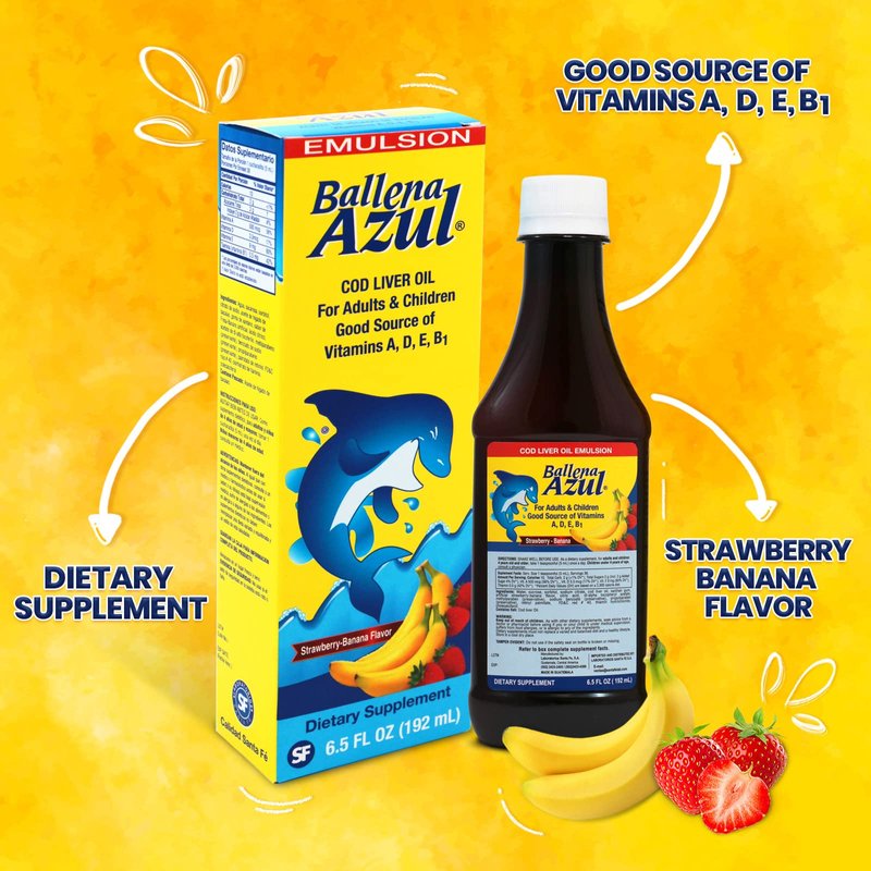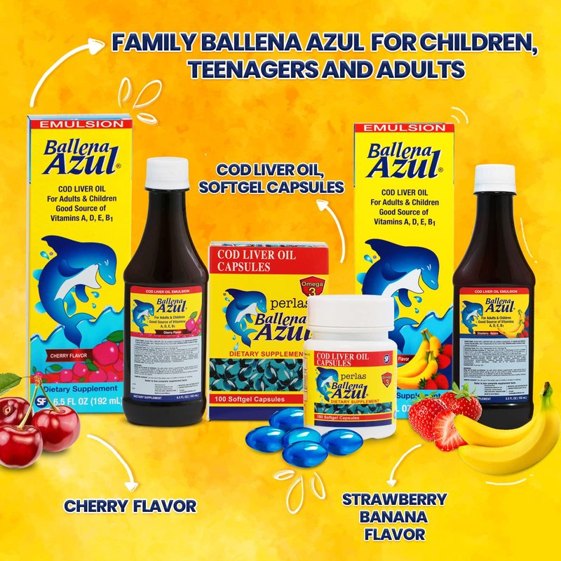 Ballena Azul Aceite de Hígado de Bacalao para Adultos y Niños, COD Liver Oil for Adults and Children, Source of Vitamins A,D,E, B1, Dietary Supplement, Omega 3,Inmune System Boost(Strawberry Banana)