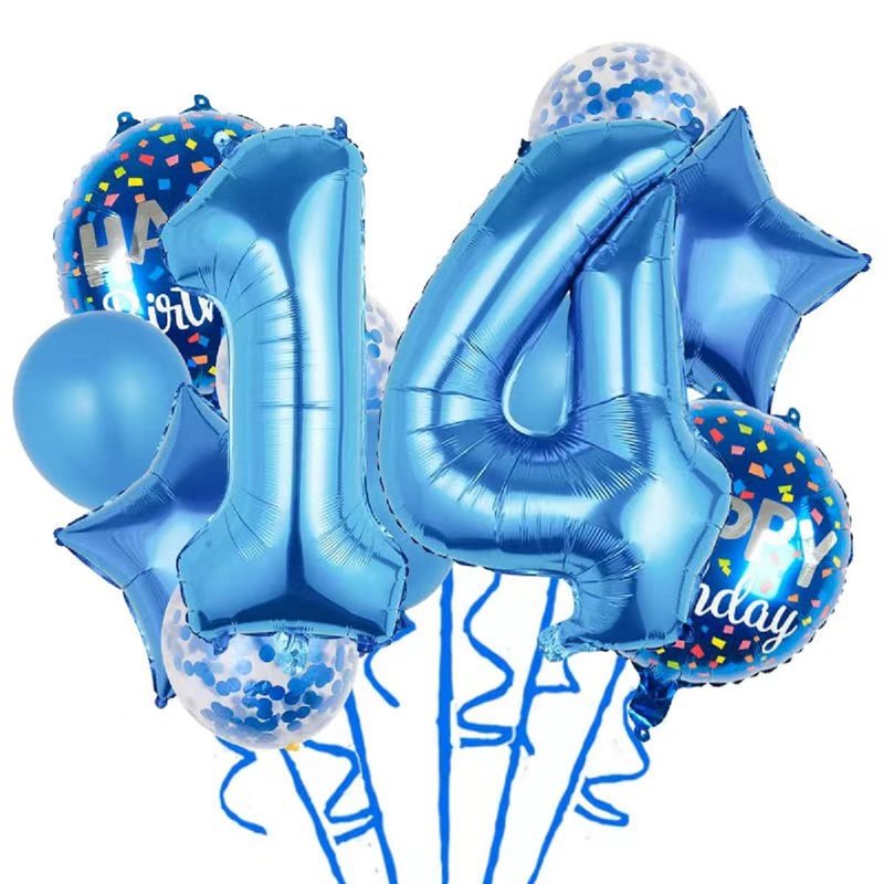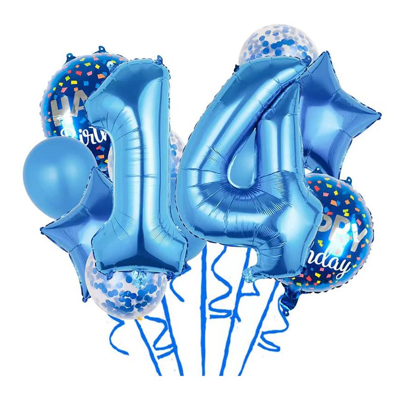 - Package comes with 2pcs 32 inch Number 14 Foil Mylar Balloons, 2 pcs 18 inch Letter Balloon, 3 pcs 12inch blue latex balloon, 3 pcs 12 inch blue confetti balloon, 2 pcs 12inch stars,1 ribbon.