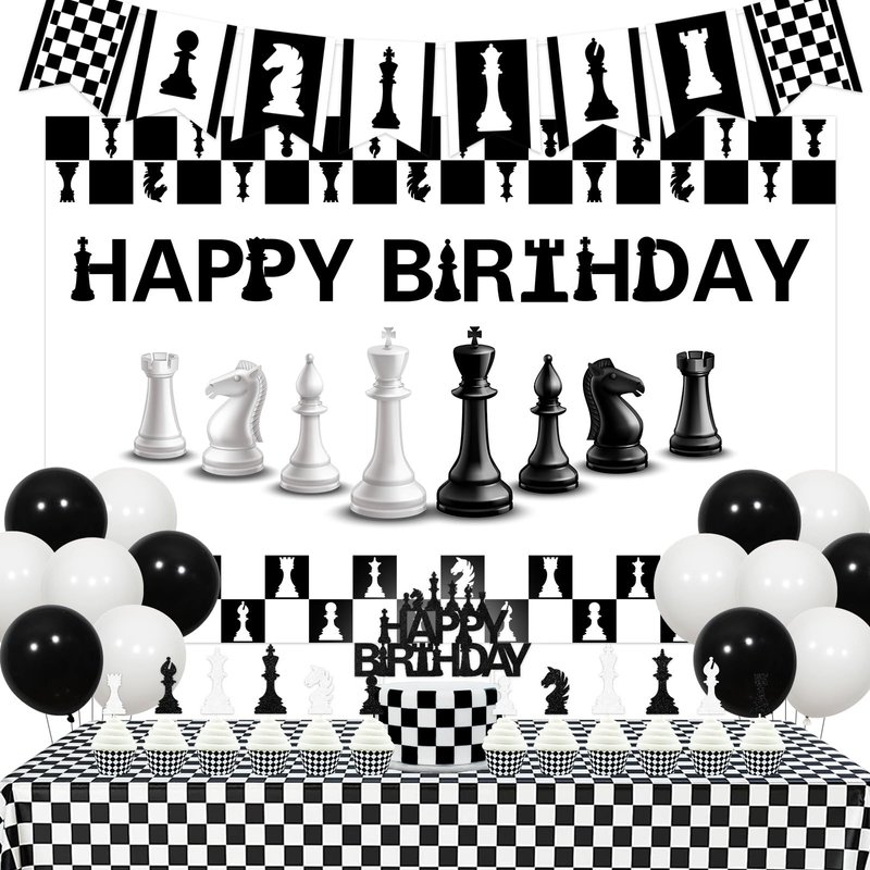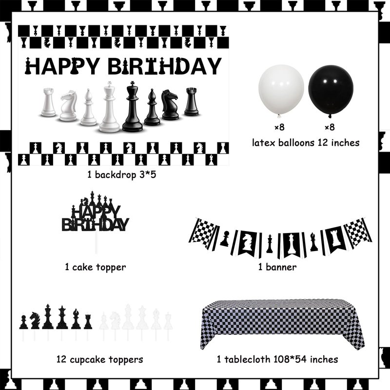 - You will receive: 1*8pcs black and white chess themed banners, 1*chess happy birthday themed backdrop, 1* black and white chess birthday themed cake topper, 1 set of 12pcs chess birthday themed cake toppers, 1*4.49*8.98 black and white checkered tablecloth, 8* 12 inch black latex balloons, 8 *12 inch white latex balloons, 2* 18 inch black and white checkered foil balloons.