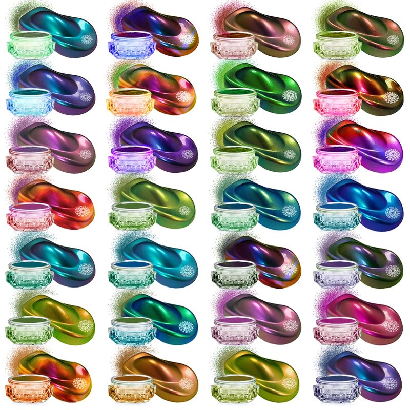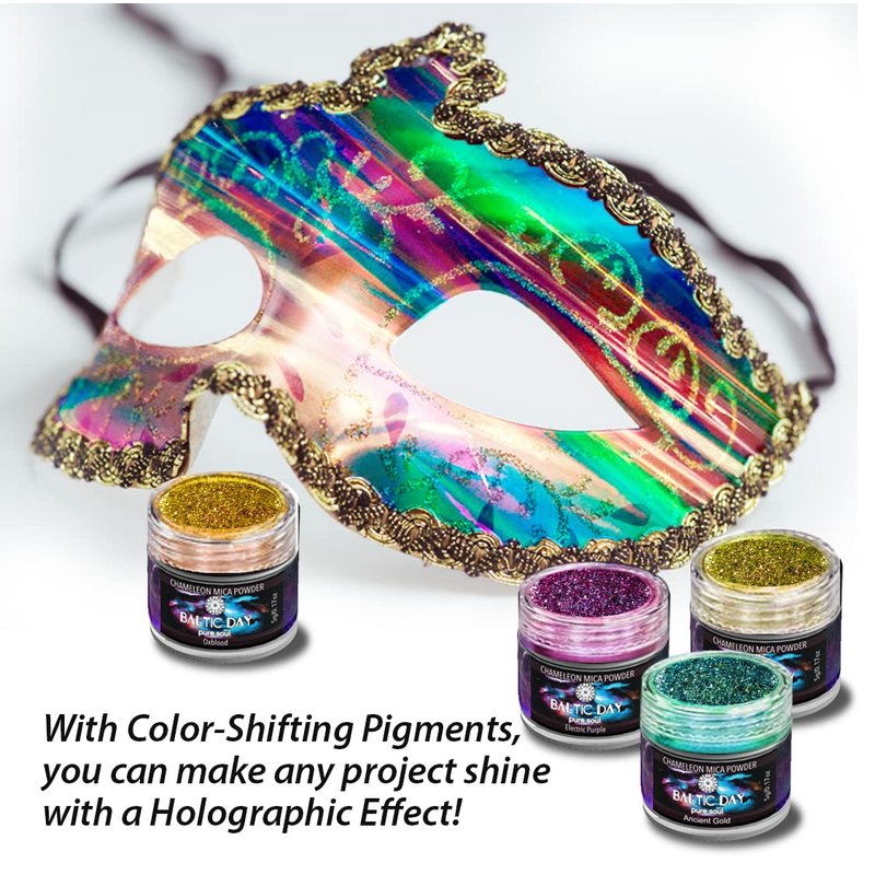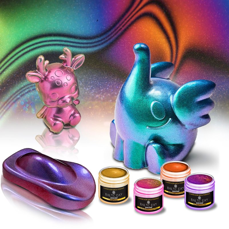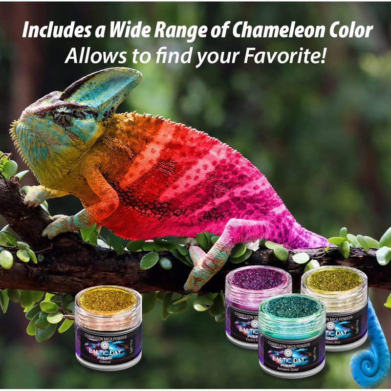 - Chameleon Mica Powder Quality - The set includes 28 chameleon mica powders. Each color contains 0.1oz bottles covering all hues of Blues, Greens, Violets, Purples, Cyans, Golds, Red, Yellows, Oranges, Brown, Turquoise. This set is different from other Baltic Day chameleon pigments, this includes only Chameleon Colors.
