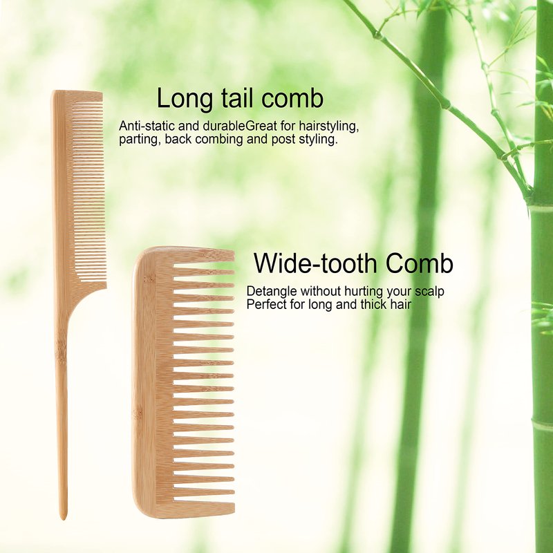 - 💆♀️【TWO ANTI-STATIC WOOD COMBS】High-quality bamboo materials will not produce annoying static electricity. 2 different types of combs can help you create a variety of hairstyles, suitable for all hair types. Wide tooth hair comb for reducing hair breakage, split ends and frizz, long tail comb with pointed wooden handle for easy separating and parting of hair.
