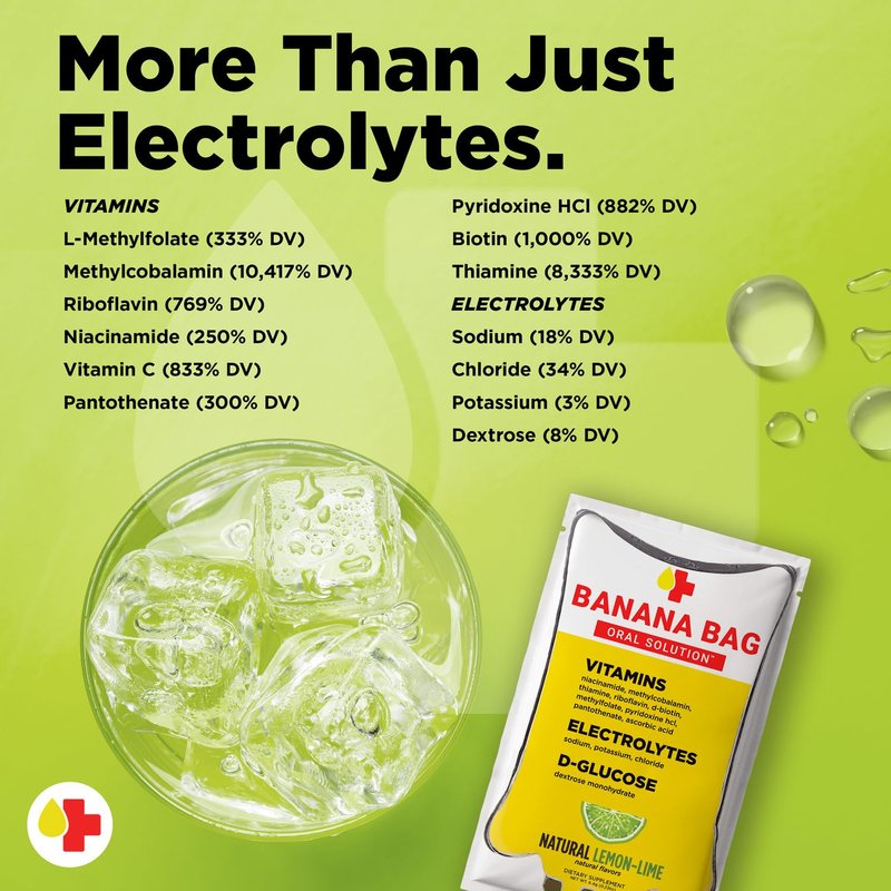 Banana Bag Oral Solution (BBOS) is a Powerful, Pharmacist-Developed Alternative to the Typical "Banana Bag" Therapy of Vitamins & Electrolytes Given Intravenously in Healthcare Settings. Now Available in a Convenient, Portable, Fast-Acting Powder to Dissolve in Water and Drink that Can Effectively Manage Dehydration, Exhaustion, and Immune Health on a Therapeutic Level at Home or Wherever you Need Clinical Relief... No Needles Necessary.