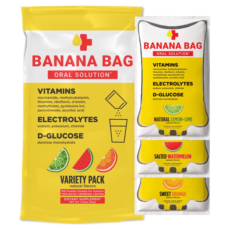 Banana Bag Oral Solution - Pharmacist Hydration Recovery Formula - Electrolyte & Vitamin Powder Packet Drink Mix - Variety Pack - Pack of 15