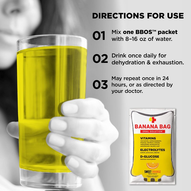 Banana Bag Oral Solution (BBOS) is a Powerful, Pharmacist-Developed Alternative to the Typical "Banana Bag" Therapy of Vitamins & Electrolytes Given Intravenously in Healthcare Settings. Now Available in a Convenient, Portable, Fast-Acting Powder to Dissolve in Water and Drink that Can Effectively Manage Dehydration, Exhaustion, and Immune Health on a Therapeutic Level at Home or Wherever you Need Clinical Relief... No Needles Necessary.