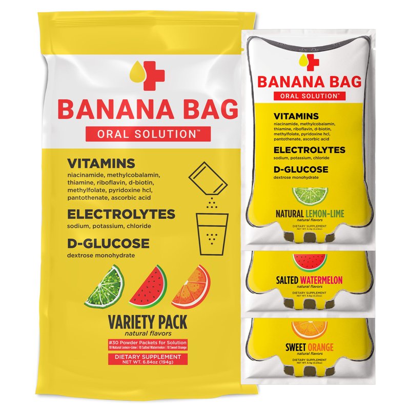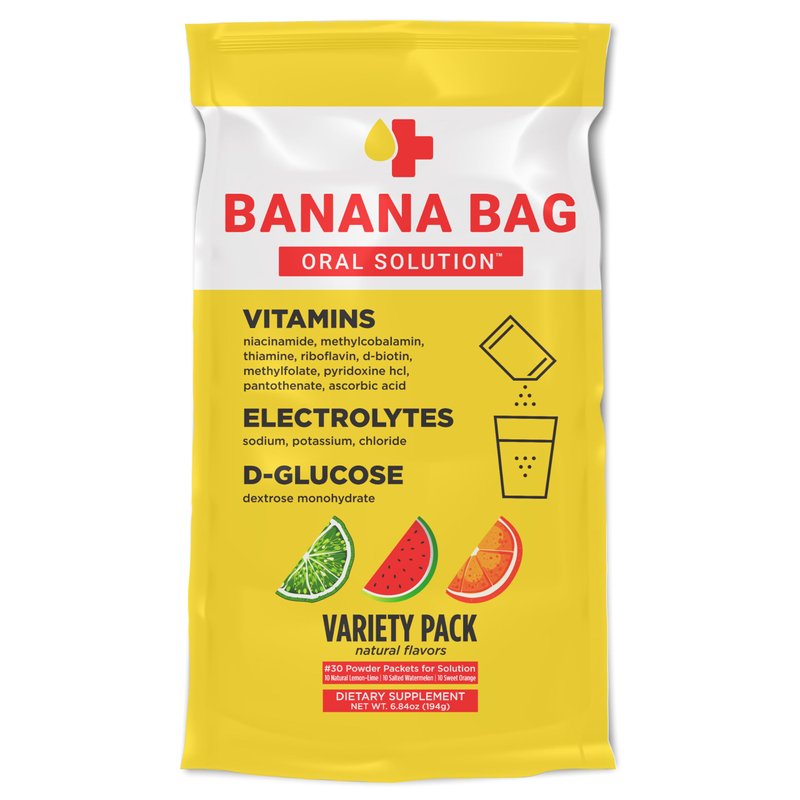 Banana Bag Oral Solution - Pharmacist Hydration Recovery Formula - Electrolyte & Vitamin Powder Packet Drink Mix - Variety Pack - Pack of 30