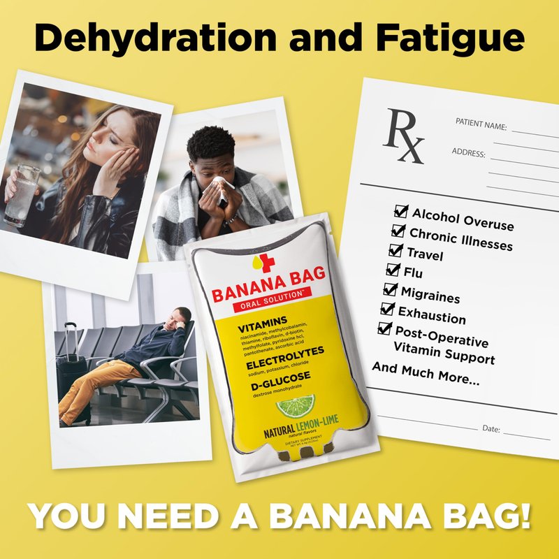 - WHY AN ORAL ALTERNATIVE? A Pharmacist-developed drinkable banana bag solution can deliver therapeutic absorption of B-Vitamins and treat dehydration without the needle sticks, costly medical supplies like saline / dextrose bags, and trips to the doctor's office.