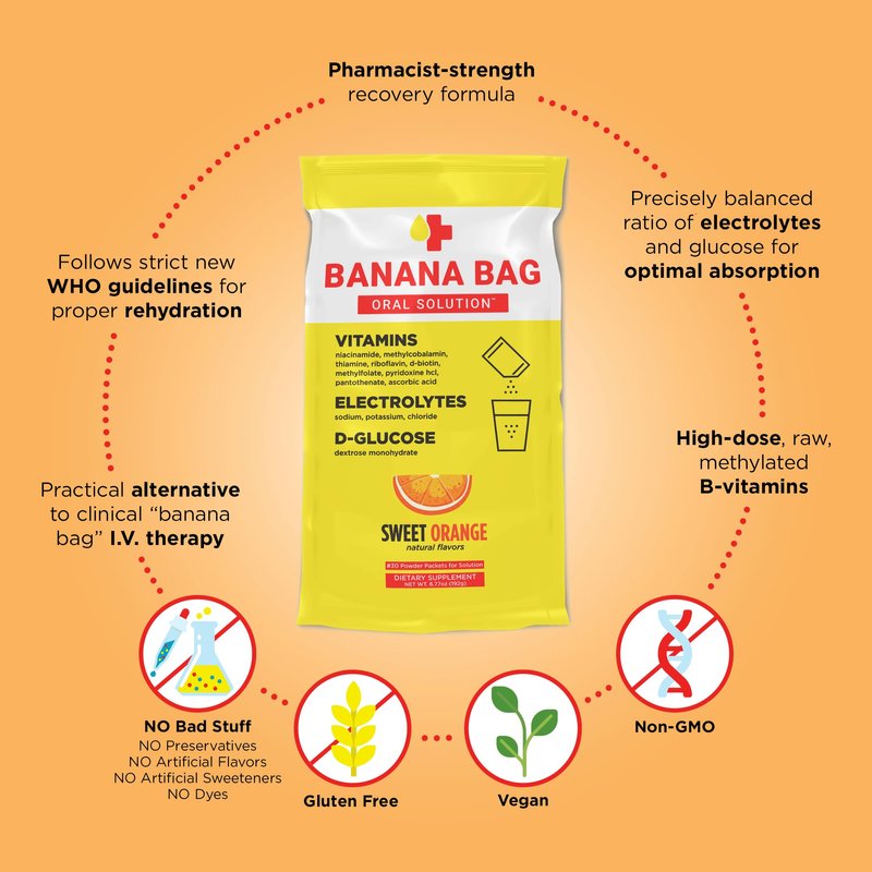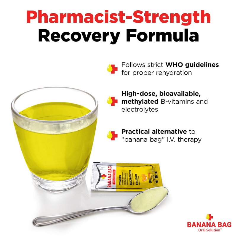- WHY AN ORAL ALTERNATIVE? A Pharmacist-developed drinkable banana bag solution can deliver therapeutic absorption of B-Vitamins and treat dehydration without the needle sticks, costly medical supplies like saline / dextrose bags, and trips to the doctor's office.