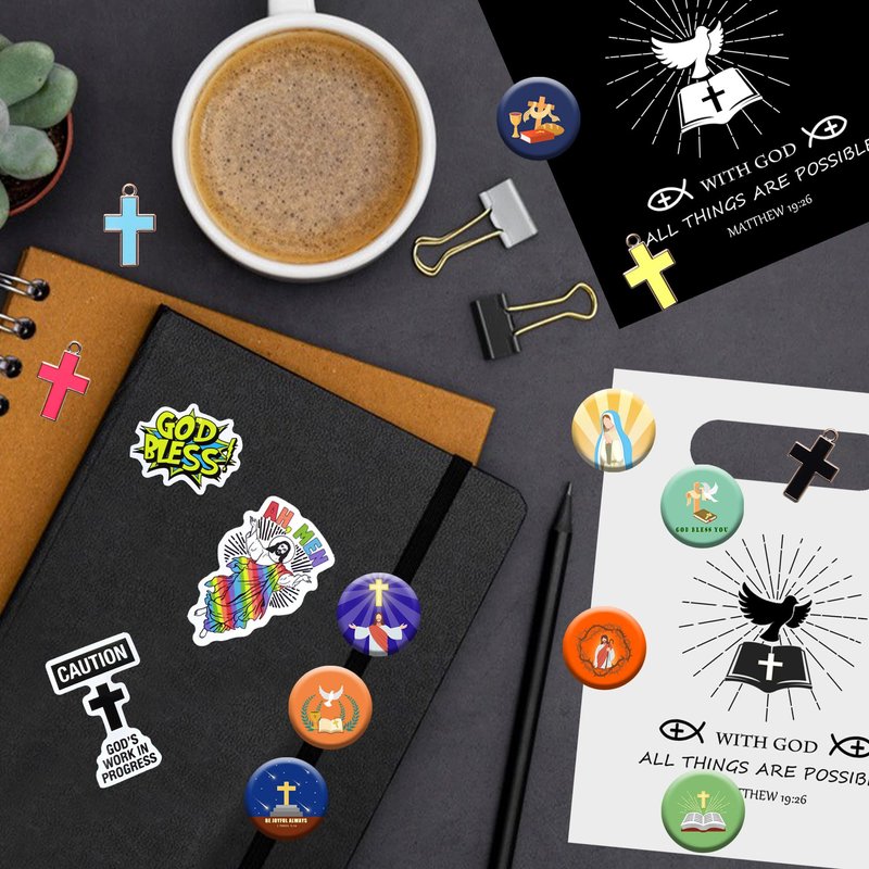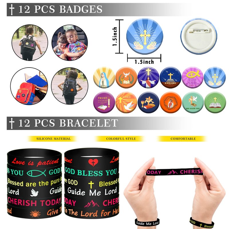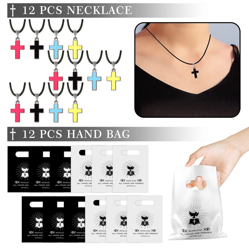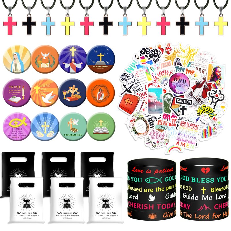 - Package quantity: 12 x button pins, 12 x cross necklaces, 12 x rubber bracelets, 50 x bible stickers, 6 x black bags, 6 x white bags. Perfect for bible party, the best goodie bags for family and friends.