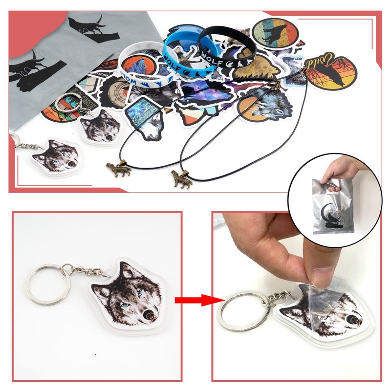 - Package included: 50 x wolf stickers, 12 x wolf keychains, 12 x rubber bracelets, 12 x wolf necklaces, 12 x wolf bags. The specific dimensions are shown in the drawing.