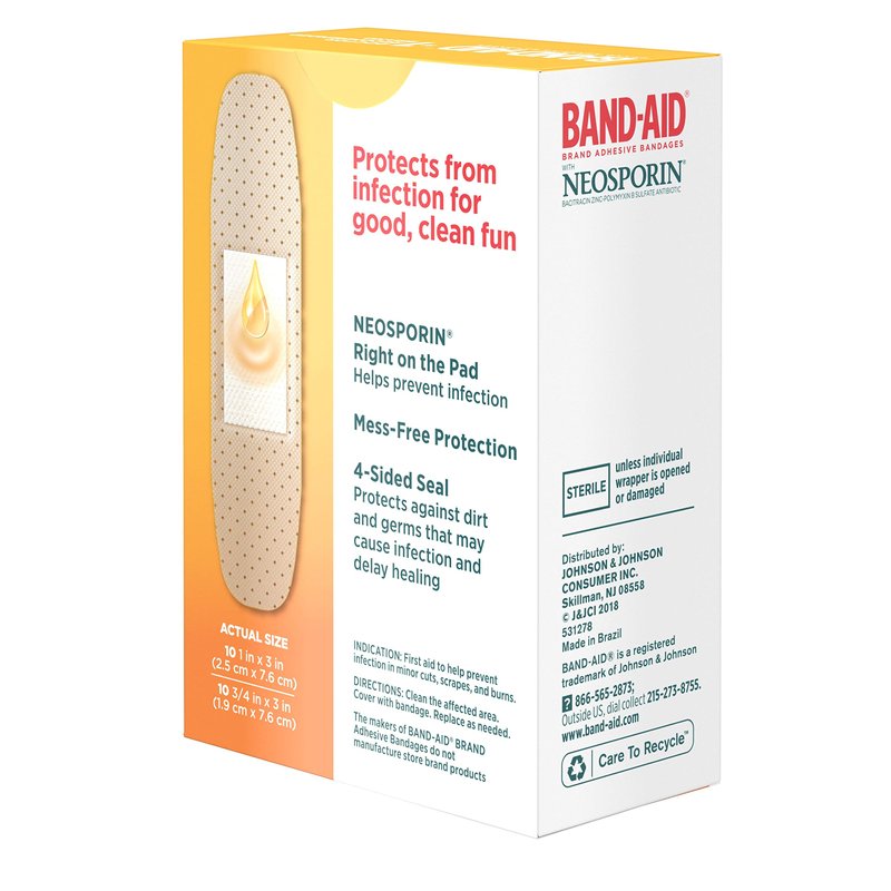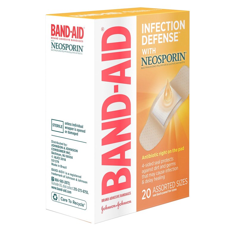 - 20-sterile bandages in assorted sizes, Band-Aid Brand Adhesive Bandages with Neosporin Antibiotic ointment on the pad for no-mess infection protection 4-sided seal protects against dirt and germs that may cause infection and delay healing