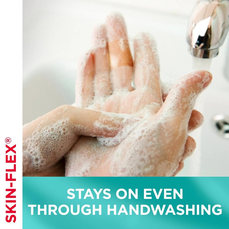 Band-Aid Brand Skin-Flex Adhesive Bandages are the only Band-Aid Brand Adhesive Bandage designed for lasting durability and exceptional comfort. These flexible bandages dry almost instantly and move like a second skin. These sterile bandages have a four-sided seal, and provide a 24-hour hold that lasts through handwashing and withstands damage and frays. The Quilt-Aid Comfort Pad on each Band-Aid Brand Skin-Flex Adhesive bandage wicks away blood and fluids without sticking to wounds, while lightweight cross-fibers stretch and flex to mold to your body.