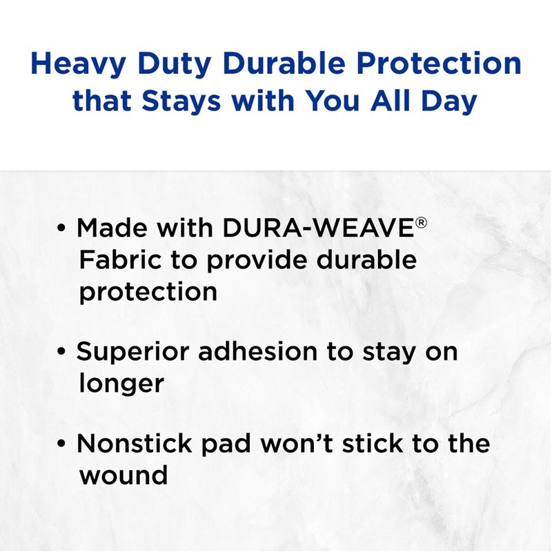 - Sterile bandages feature Dura-Weave heavy-duty fabric with a strong adhesive to stay on up to 24 hours