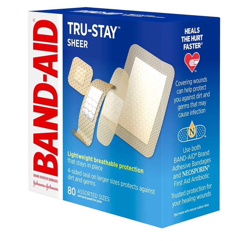 - 80-count box of Band-Aid Brand Tru-Stay Sheer Strips Adhesive Bandages to help minor cuts and scrapes heal.