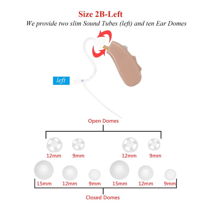 Banglijian Hearing Amplifier Replacement Slim Sound Tubes and Domes for Ziv-201A, Ziv-201, Ziv-206, Ziv-201P, Ziv-201V and BLJ-109(2 Tubes-Size 2B and 10 Domes, Left Side)
