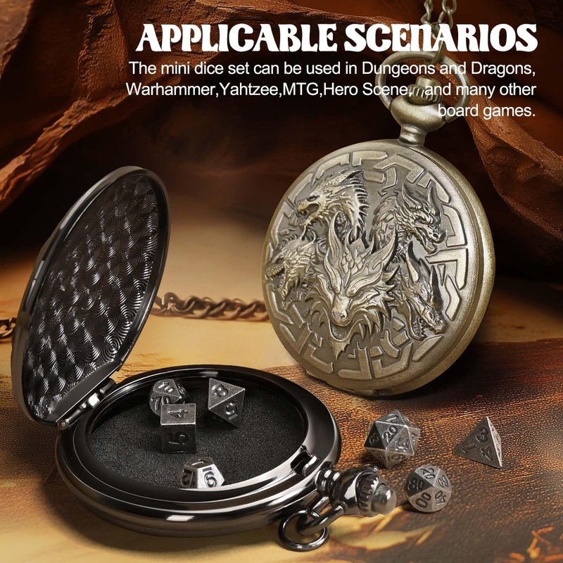 - UNIQUE DRAGON PATTERN:The mini dice come in a pocket watch box with a vivid dragon pattern on the top of the pocket watch,embossed craftsmanship,made of aluminum alloy,an original design by our designers,which brings visual shock and impact,and at the same time,adds a touch of creativity and protection to your dice,making your dice more elegant