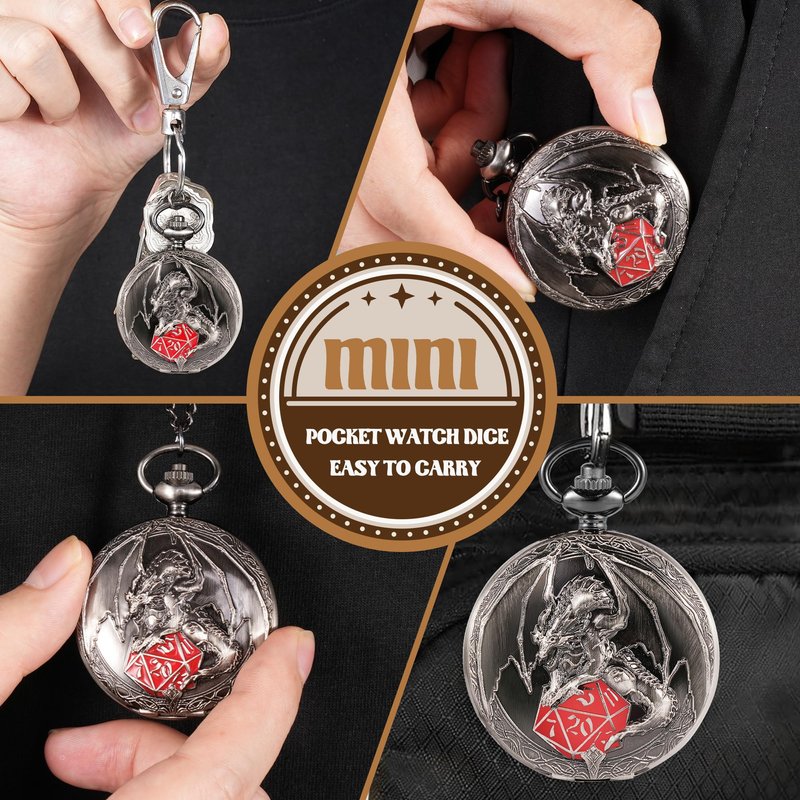 - Easy to Carry: The pocket watch contains 7 polyhedral mini dice, we can directly carry the pocket watch inside our pocket or hang it around our neck as an ornament by the metal chain, which is easy to carry and not easy to be lost, allowing us to play exciting role playing games anytime and anywhere