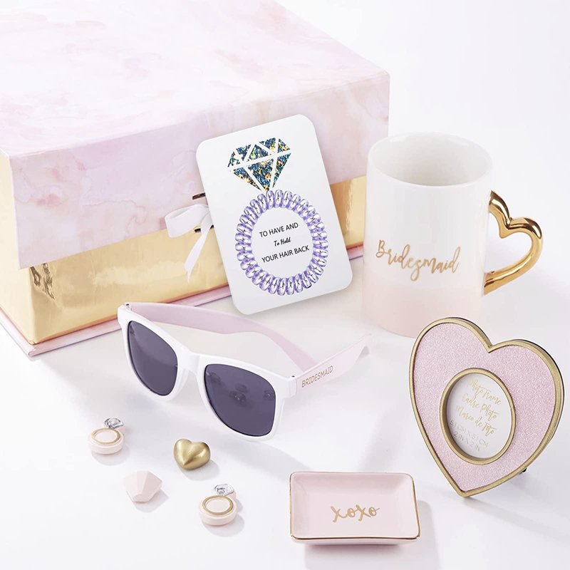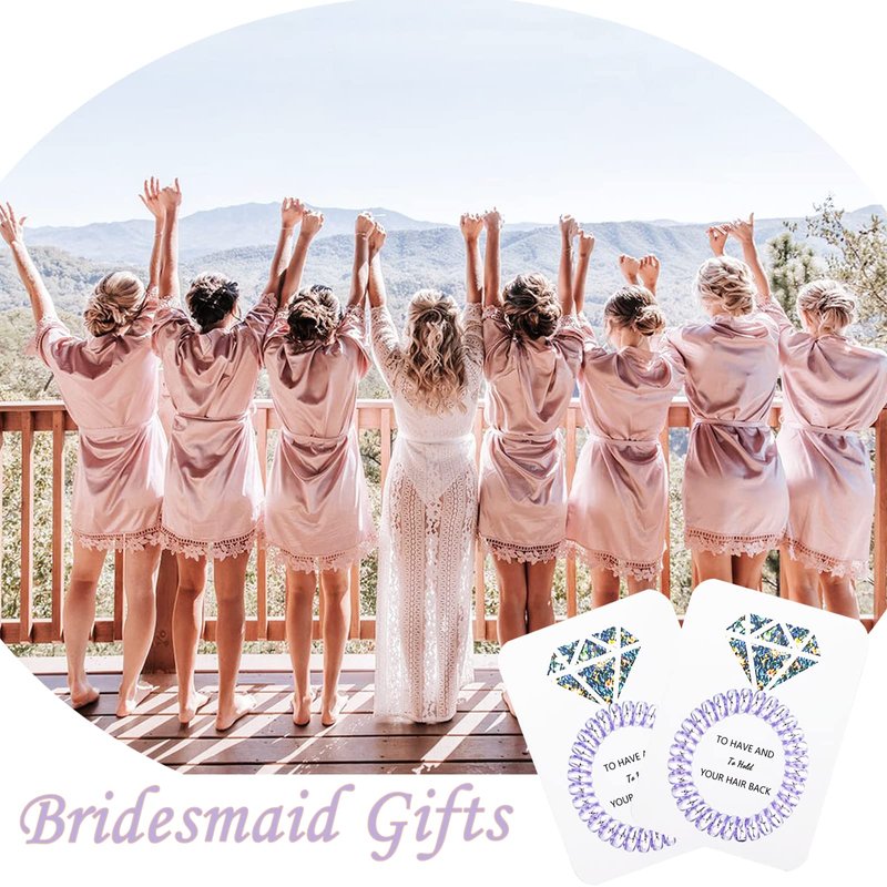 - đăGreat Addition to Your Wedding Party BoxesăBridesmaid proposal gift boxes are a cute way to say âthank youâ to the girls instead on your wedding day. Shiny coil hair ties are a great addition. The back of the diamond card is blank and you can write blessings on it. That would be more precious wedding favors.