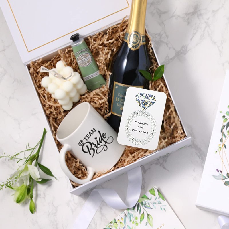 - đăGreat Addition to Your Wedding Party BoxesăBridesmaid proposal gift boxes are a cute way to say âthank youâ to the girls instead on your wedding day. Shiny coil hair ties are a great addition. The back of the diamond card is blank and you can write blessings on it. That would be more precious wedding favors.