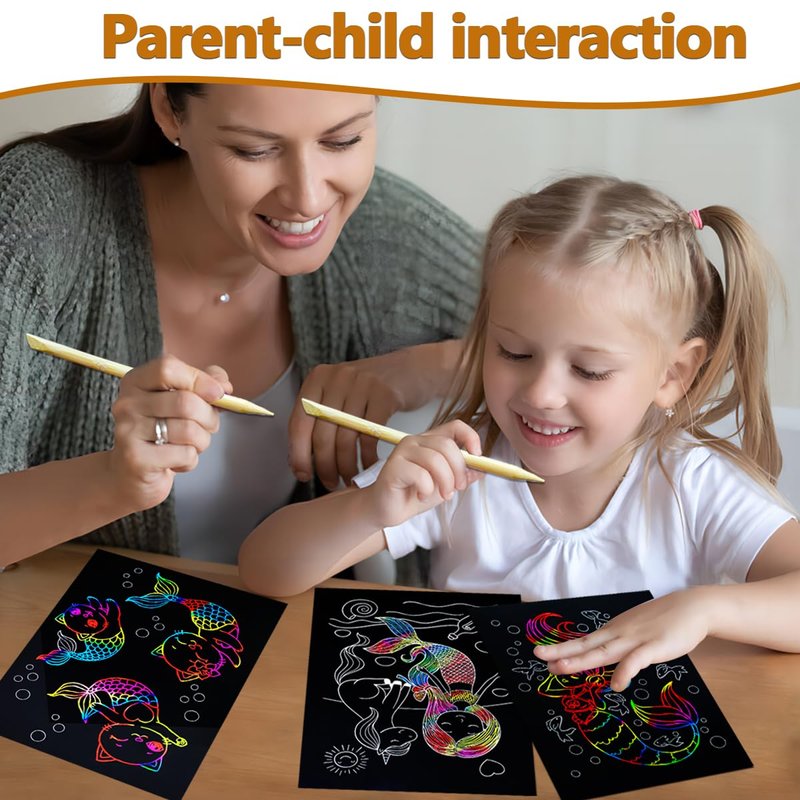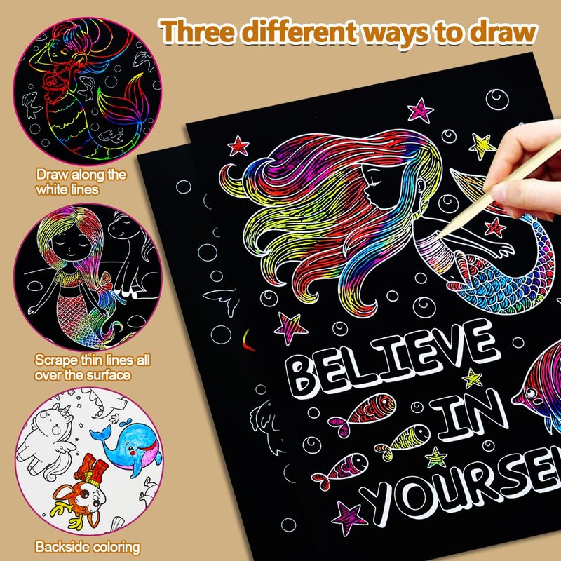 - 【Scratch Art For Kids 】Scratch the surface of the black scratch paper with a wooden pen to reveal a hidden world of vibrant and magical colors. Kids scratch art is designed with two different options, you can scratch off it all to get the rainbow art painting, or outline the pattern you want to design along the designed lines, the rainbow and black color match, more show your artistic talent. Ideal scratch art for kids, scratch art paper, scratch paper art set for kids, scratch coloring book
