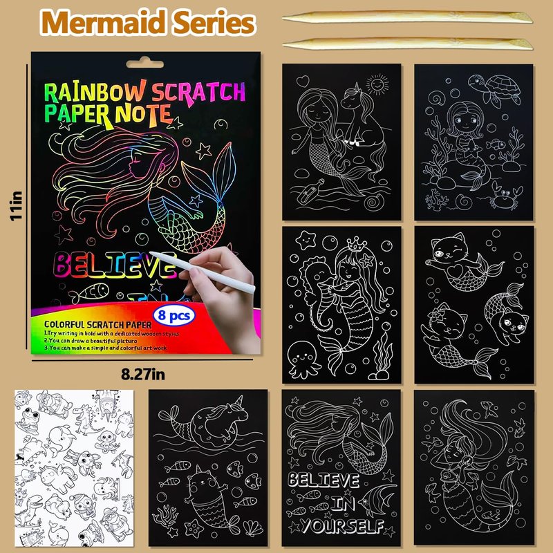 - 【Scratch Paper Art Set For Kids 】8 sheets of scratch art with different pictures, the back of the scratch art is a coloring pictures, 2 Wooden Styluses, Packaged in a beautifully printed envelope bag and ready to give as a gift. Ideal christmas crafts for kids, kid party favors, kids birthday party favor, kids christmas gifts, stocking stuffers for kids