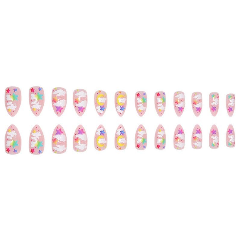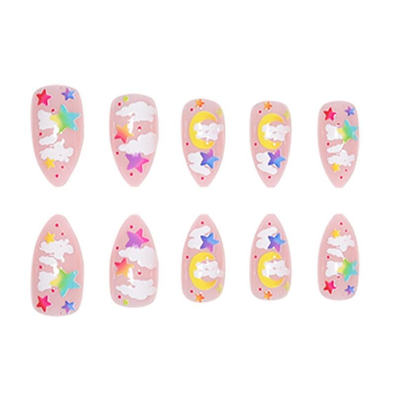 BAOYAALIN Colorful Almond Shaped Press on Nails Medium Fake Nails with Star Moon Design Glitter Full Cover False Acrylic Glue Stick on Nail for Women Girls 24Pcs