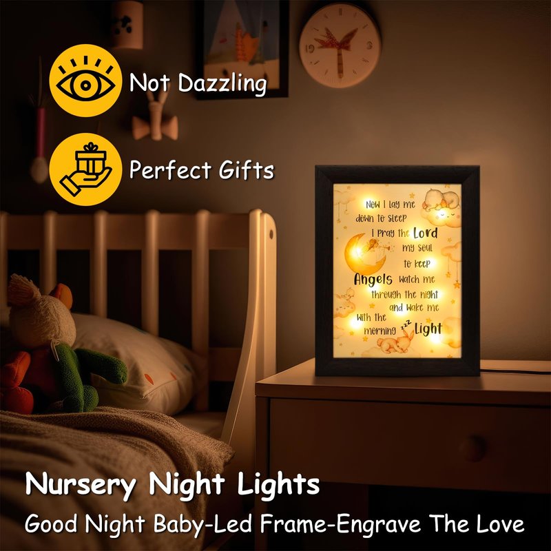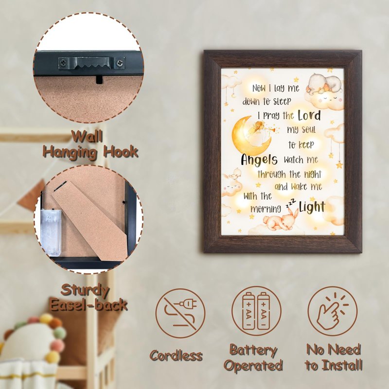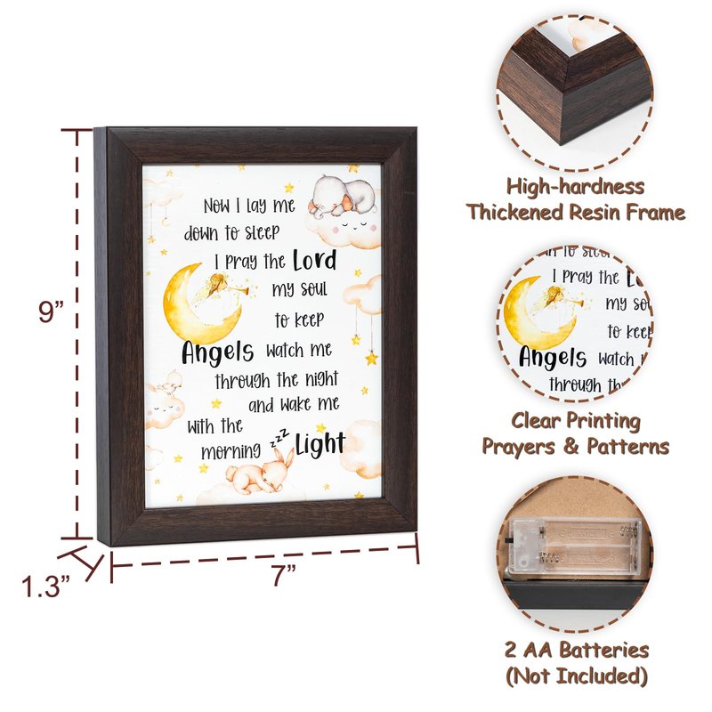 - ⭐Unique Design & High-quality Materials: The LED frame is made of high quality resin and measures 7" x 9" x 1.3", durable and sturdy. The faux wood grain frame with unique & cute design is a nice addition to the nursery! Ideal godparents gifts for baptism, dedication gifts for boys.