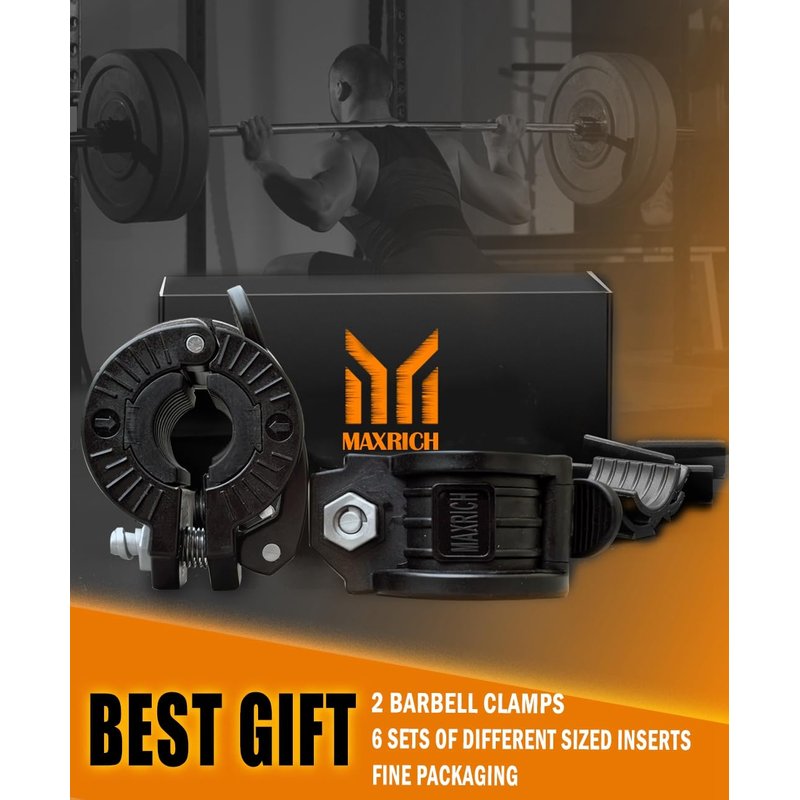 - PACKING LIST: 2 weight bar clips +1inch inserts(4pcs)+28mm inserts(4pcs)+30mm inserts(4pcs)The MAXRICH barbell clamp will help you exercise in a more perfect form. The innovative design firmly locks the weight without losing weight. Try it and you will be pleasantly surprised!