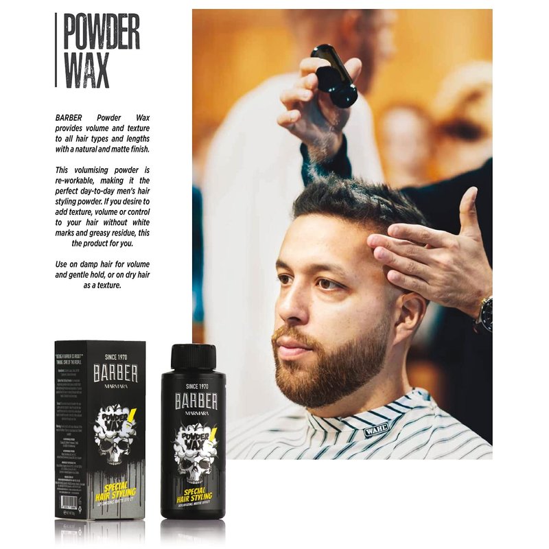 - BARBER Powder Wax Volumizing Matt Effect - gives volume and texture for all hair types and lengths with a natural and matt surface. This volumizing powder can be reworked so that it brings out the perfect men's hair in everyday life. If you want, add texture, volume, or control without white spots and greasy residue. Easily washable.